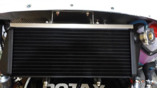 Radiator didn’t line up exactly with hole in cowl, so I manufacture a baffle from some scrap aluminum to extend the back of the radiator and fill the gap so air would not bypass the radiator. Attached using the upper radiator bolts. Measured the gap between the baffle and cowl and cut cowl with Dremel so there was a 1/8-1/4 inch gap between the baffle and the cowl. Primed the cowl with tape primer and attached the foam extending it ~1/4-3/8” beyond the edge of the baffle on the cowl so it would seal with on the radiator and baffle I manufactured. Now it is a nice tight fit so now all the air should go through the radiator.