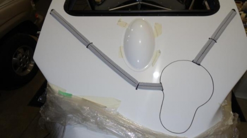 Used pieces of popsicle sticks epoxied to the bottom edges of the cover to work as spacers to hold cover flush with top of fuselage and keep an even gap around the cover. Sanded down popsicle sticks until top of cover was flush with top of fuselage. Use about a 1” bead of hot glue to in 4 evenly spaced positions around the cover to fill the gap and glue the cover down. Filled in the remaining gap with silicone rubber.