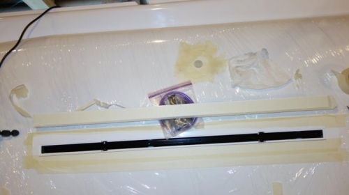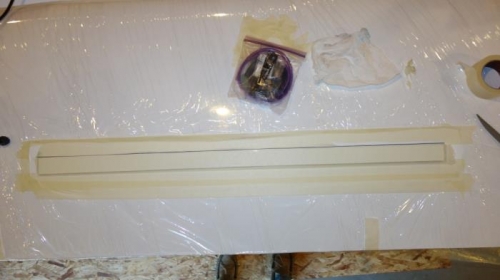 Used masking tape and a washable marker to mark uncut cover after setting it on top of the airbrake assembled in wing. Drew a line around the outside of the cover on the masking tape on top of the wing. Remove masking tape, re-applied tape to cover with the line just drawn aligning the drawn line to the edge of the cover. Put masking tape alone the inside line made by the making tape that was just applied so the two edges of the masking tape butt together were the cover needs to be cut (it is easier to sand up to the masking tape than to sand away the masking tape). Removed the masking tape on the outside (with the line on it). Then sand the cover up to the masking tape (do this for each edge). When all 4 sides are done, put the cover back on top of the retracted airbrake. Using tape, mark any places that need more material removed to fit in airbrake cover slot and sand up to the tape. Once the cover fits in the cover slot, again apply masking measuring 1mm from the edge (make a 1mm gap all the way around). Sand up to the tape. Fitted it again and marked 1mm again taking into account the slight movement of airbrake in slot and sanded again such that what ever slight movement the airbrake makes in its slot, there will always be a slight gap so it doesn't hang up when opening and closing. Should have shot for a .5mm gap. The airbrake moved a little when I thought it was all the way back and I remove a little more than I would have liked from the front side of the brake cover.