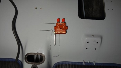 I choose to move the parking brake forward from recommended location to alongside the instrument panel. I had to cut a slot in both the floor and the instrument panel floor mount for the actuation lever. Cut remaining brake line holes in cockpit floor and mounted (temporarily until I install landing gear) the parking brake. Came up with a method to secure the brake lines on the bottom of the fuselage floor so they won't interfere with the flight controls