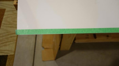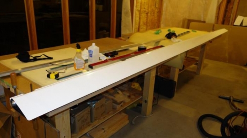 Had to trim off the area were the two haves of the aileron were clamped together in the manufacturing process. It was hard to determine how much to take off, so I just sort of eyeballed it applying masking tape right along the “curve” in the tail of the aileron where the clamps were applied to hold the skin on the aileron while the epoxy dried. I then used my power belt sander to sand just up to the edge of the tape.