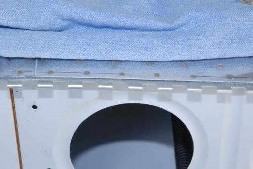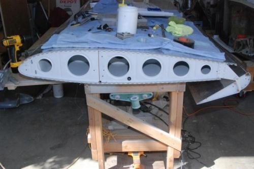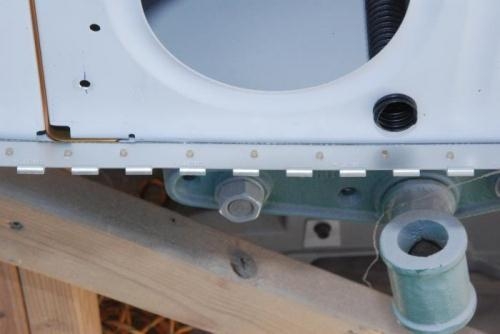 Once the hinge was drilled to the fiberglass tip, I was removed the wing side hinges, trimed the spacer fiberglass at the split-line, countersunk the holes and the skin, and riveted the wing-side hinges in place. Super easy with the squezer. I used a wider hinge on the wing side so that none of the hinge eye cutouts are visible at the split-line.