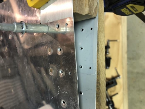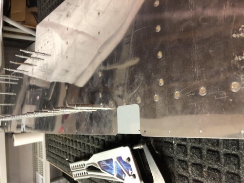 Finished riveting left elevator skin to frame except top flange for trim tab