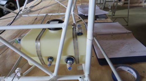 Drilled holes in header tank for fittings. Installed tank fittings using blue loctite. Leak checked and sealed all fitting to lock out contamination. Installed header tank with supplied straps. Not happy with the mounting and will devise a method of making tank more secure, including antichaffe tape under straps.