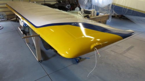 Masked off area of left wing to be trimmed in Metallic Blue. Painted metallic blue trim on left wing. Carefully removed masking and cleaned up 2 small spots of overspray.