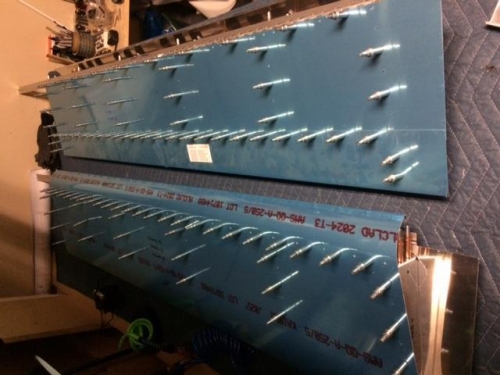 Pulled one side of the protective sheeting from the bottom of the top skin. Clecoed on the top skin for both flaps and marked all parts for location (left, right, inbount, outbound, forward and aft.
