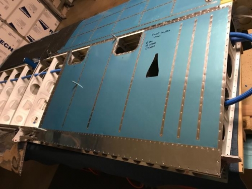 After verifying the linkage for ailerons and servos, as well as running additional plumbing for AOA. I finanally started riveting the bottom skin on the right wing. (I'm still waiting for some fastners for the 1/4" lines.