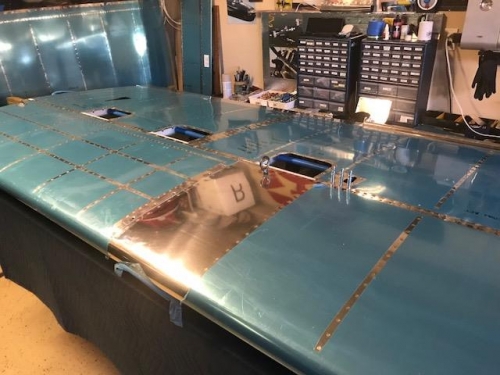 Completed the riveting of the outbound bottom skin on the right wing. Everything lined up nicely, with no bubles/twist in the aluminum skin