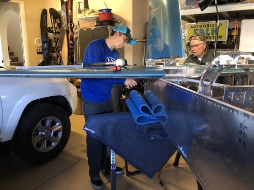 My dad was in town and spent the day helping me align and mount the vertical stabilizer. We verified the distance from the top rear edge of the vertical stab to the outer rear edge of the horizontal stab. Measure, move, measure, move. again and again. We finally landed on 62 3/8" on each side. Marked the three rear spar locations on the vertical stab. Removed the stab and drilled the #30 holes. Remounted and final drilled the 1/4" holes. Bolted and marked the two holes on both sides of the location hole. Removed the stab and drilled #40 holes and then final drilled the #30 holes and then the bolt holes. Temp bolted the assembly together. We then mounted an angle on the back of the vertical stab and measured out 6" on each side. Strung a stringline from the angle to the second bulkhead and measured the distance from the vertical stab to each side. Measure, move, measure, move. We finalized the lateral distance and movement clamped the vertical stab to the 884/885 mount/spacer. We then strung a stringline down the 3 hinges and confirmed that the assembly was aligned and straight. We then drilled the #30 holes in the front mounting plate and spacer for the vertical stabilizer. Removed everything and deburred the parts. D/A, scuffed up the spacer and the two sihims that are the flat horizontal sapcers fro the mounting of the horz. stab. Also d/a'ed the rear control lock for the vertical stab. Primed all parts. Clean up all pieces, rived the spacer to the assembly and mount. (Jennifer game me a wonderful piece of art