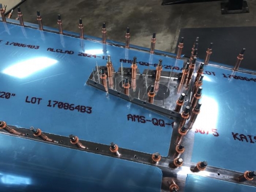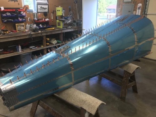 Dimpled forward rib and nutplates. Installed nutplates to rib. Clecoed rib to tailcone