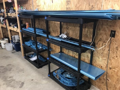 Uncrated empennage kit, and inventoried parts. We organized large parts onto shelves, and small parts into labeled bins. I found 2 missing parts AN257-P3X3' hinges. Sent email to Vans and new hinge material has been sent.[