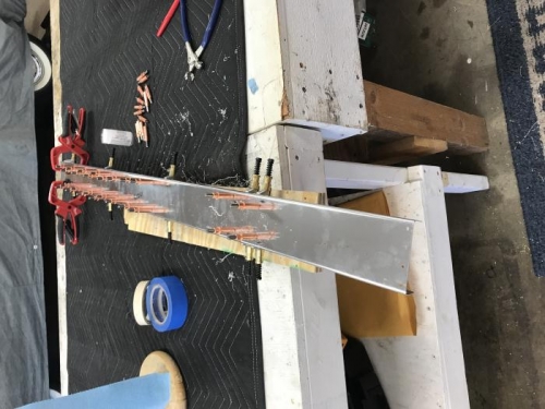 Seperated spar cap material, clamped to spar and match drilled holes. Deburred edges and holes of all parts