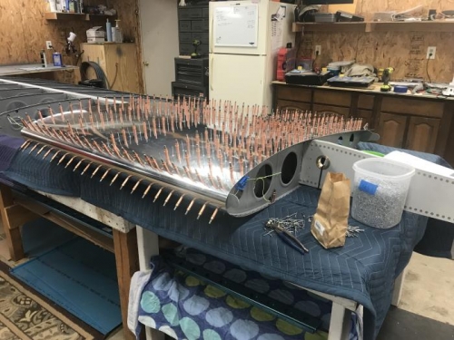 Begain install of inner bottom wing skin. Dimpled called out holes and clekoed skin to to skeleton. final drilled holes in doubler to skin and spar flange. Removed and deburred skin, spar and doubler. Cleckoed skin to skeleton again and riveted in called out locations
