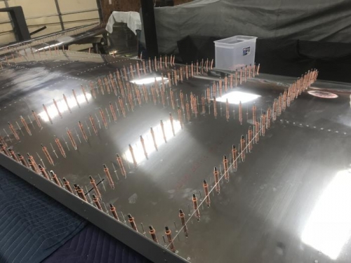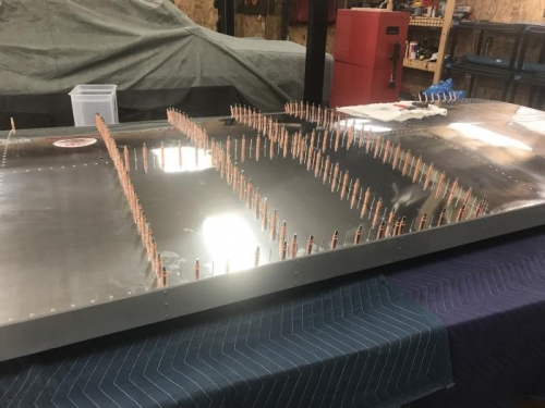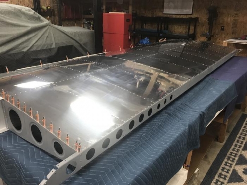Deburred then installed middle right wing skin. Riveted in called out locations.