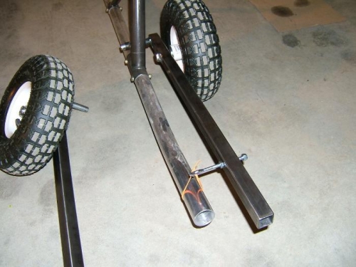 Constructed ground handling wheels. Square steel tubing, 5/8 bolts, 10" Harbor Freight wheels. Total cost about $20.