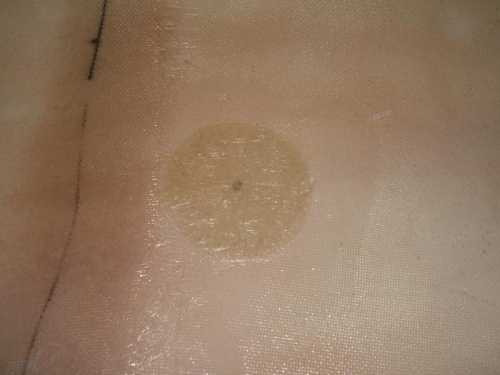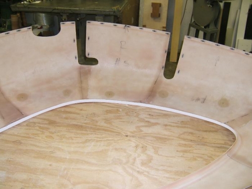 Applied six 2" glass matt patches to the inside of the right cabin half over the mounting holes. These will add some strength to the screw holes as well as help shim the cabin to floor pan to reduce dimpling under the screws.